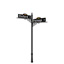The Oxford Traffic & Street Name Signs and Post Packages with Special Ground Mount are based on our original and most popular ornamental system. Packages utilize modular components including 3" posts, post bases, ornate welded cantilever wing brackets and finials to create a classic design. Powder coated semi-gloss black. Pre-designed packages save time and money. NOTE: All Signs come standard with High Intensity Prismatic (HIP) sheeting. All Street Name Signs come standard as a Flat, Double-Faced Sign Blade. Bases, Posts, Brackets and Hardware are powder coated semi-gloss black for an elegant look.